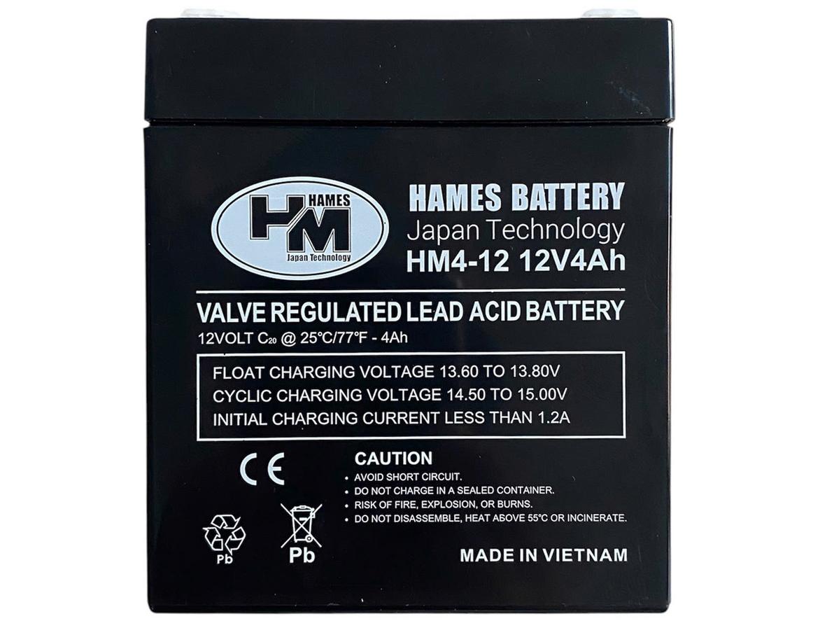 Ắc quy Hames HM4-12 (12V 4Ah) là loại ắc quy kín khí, miễn bảo trì, được sử dụng phổ biến làm nguồn điện dự phòng và cho các thiết bị di động như loa kéo, bộ lưu điện (UPS), và xe điện trẻ em.