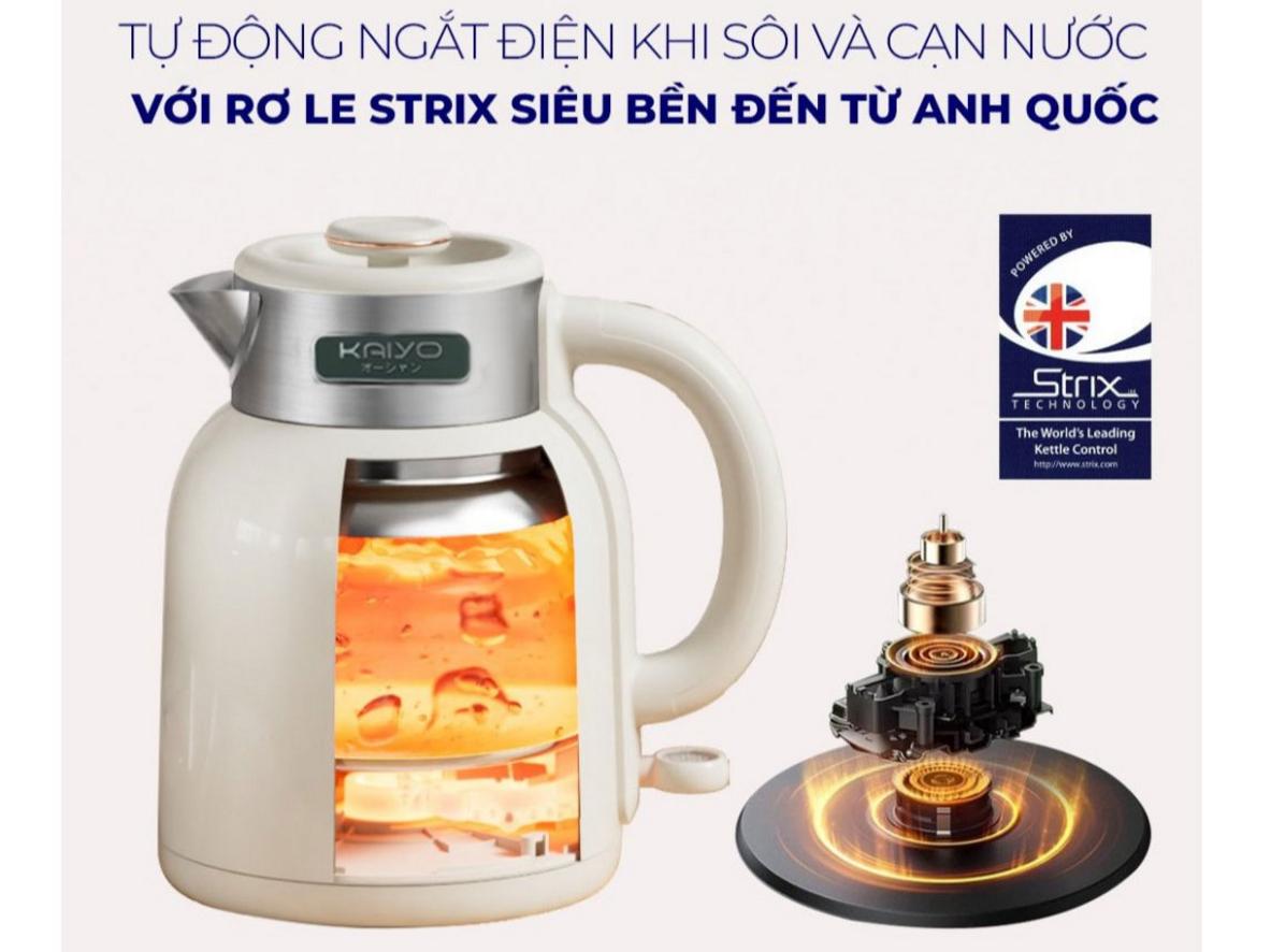 Trong danh mục Ấm siêu tốc của chúng tôi, Kaiyo nổi bật nhờ kết hợp vật liệu an toàn và cơ chế bảo vệ thông minh. Ruột làm từ inox 304 không gỉ giữ nước sạch; bộ điều khiển Strix (UK) tự ngắt khi sôi hoặc khi cạn nước, giúp bạn yên tâm sử dụng hàng ngày. Đế tiếp điện xoay 360° cùng công suất 1.400–1.600W cho tốc độ đun nhanh — tiện cho pha trà, cà phê hoặc nấu mì liền.
