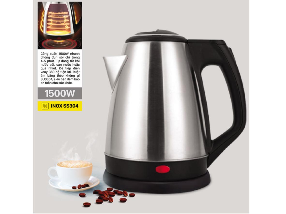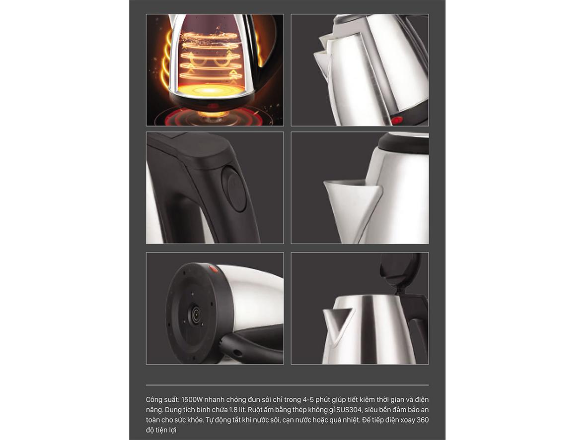 Công suất 1.500W giúp ấm đun sôi 1.8 lít trong khoảng 4–6 phút, tiết kiệm thời gian rõ rệt so với đun bằng bếp than hay nồi nhỏ. Thời gian sôi nhanh đặc biệt hữu ích vào buổi sáng bận rộn hoặc khi bạn cần nước nóng ngay lập tức. Thiết kế hiệu quả tập trung nhiệt nên tiêu thụ điện hợp lý cho nhu cầu gia đình.