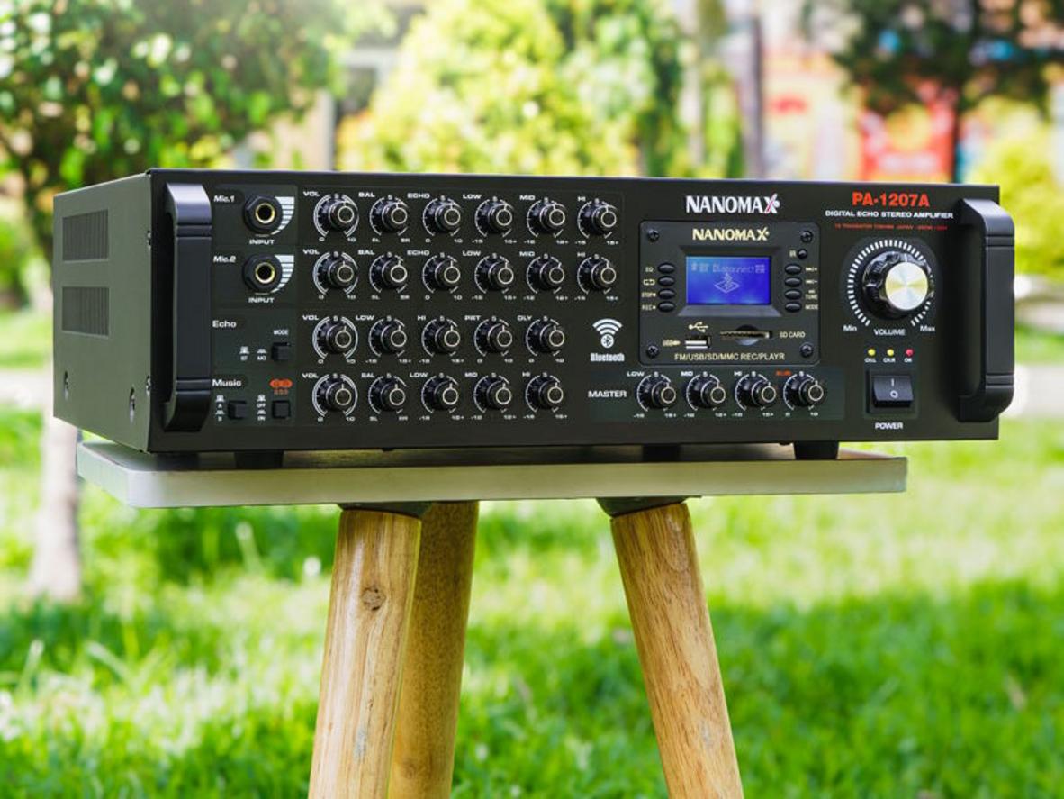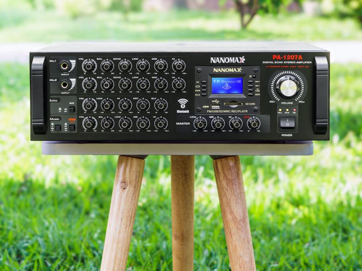 Amply Karaoke Bluetooth Nanomax PA-1207A ( 16 Sò ) là ampli karaoke công suất lớn với 16 transistor Toshiba (sò) và công suất tối đa 850W, thiết kế cho dàn âm thanh gia đình chuyên nghiệp và sân khấu.
