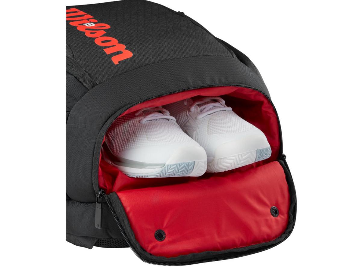 Ngăn giày riêng với lỗ thông hơi và lớp MoistureGuard giữ đồ bẩn và ẩm xa những vật dụng còn lại. Vị trí ngăn ở đáy balo giúp tách tối ưu, đồng thời hệ thống chống ẩm bảo vệ vợt và laptop khỏi hơi ẩm còn sót sau trận đấu. Thiết kế này tiết kiệm thời gian vệ sinh và ngăn mùi lẫn vào quần áo sạch.
