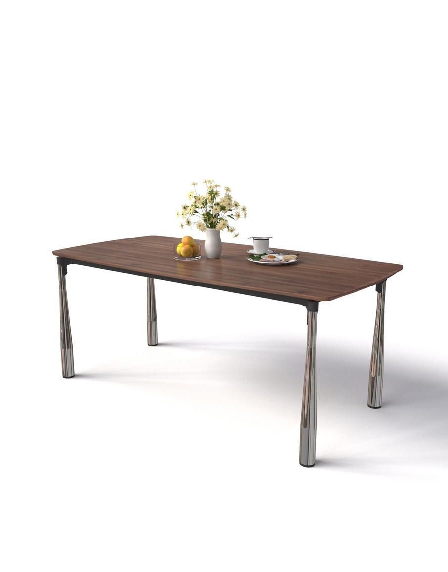 Khung chân sử dụng thép sắt kiểu gậy bóng chày mạ giả inox màu nòng súng không chỉ tạo điểm nhấn thẩm mỹ hiện đại mà còn tăng thêm độ chắc chắn, tránh han gỉ so với chân gỗ hoặc chân thép sơn tĩnh điện thông thường. Kích thước 1800x900x753mm phù hợp đa dạng không gian phòng ăn từ gia đình 4-6 người đến các nhà hàng, quán ăn cao cấp.