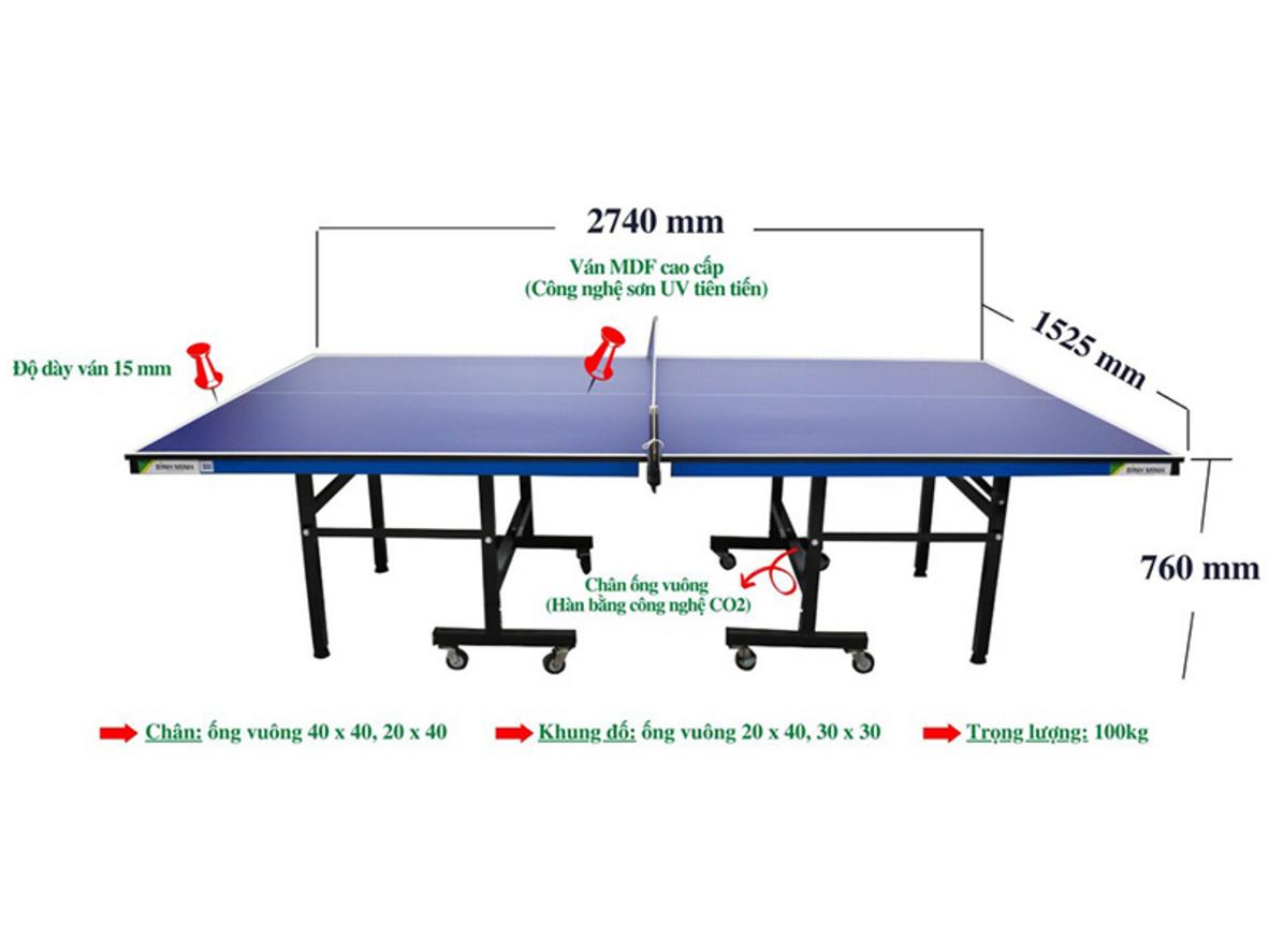 • Thông số nổi bật: Mặt MDF dày 15mm phủ sơn UV cho độ nảy ổn định; kích thước chuẩn 2740 x 1525 x 760 mm; khung thép hàn CO2 chắc chắn; 8 bánh xe 360° có khóa; có cơ chế gấp gọn đôi.