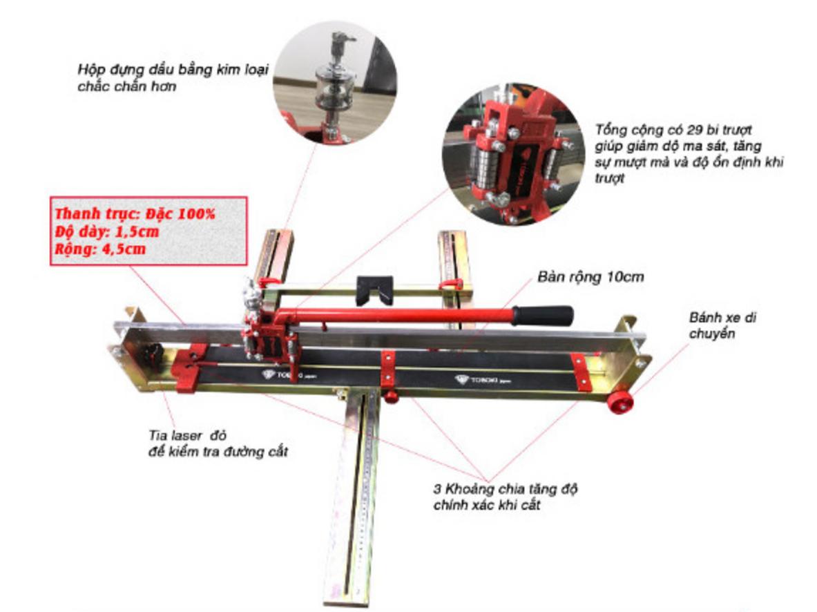 Giảm hao hụt gạch và rút ngắn thời gian hoàn thiện công trình. Hệ dẫn hướng sử dụng nhiều vòng bi giúp hành trình mượt, đường cắt thẳng và ít lực đẩy. Tia laser và thước đo 3 bên cho phép bạn can nhanh vị trí cắt, tránh sai số khi lát diện tích lớn. Kết quả: ít phế liệu, chủ thầu hài lòng.