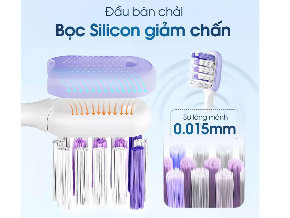 Đầu chải kết hợp đệm silicon và lông siêu mảnh 0.015mm giảm chấn rõ rệt cho nướu. Bộ máy cung cấp 15 chế độ, bao gồm chế độ nhẹ cho răng nhạy cảm và chế độ làm trắng chuyên sâu. Bạn có thể tinh chỉnh nhanh để cân bằng giữa hiệu quả và thoải mái.
