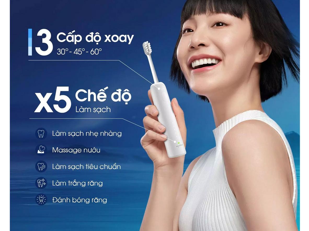 Thiết kế này cho phép làm sạch sâu mà vẫn nhẹ nhàng. Nếu bạn dễ ê buốt, chọn chế độ nhẹ; nếu muốn làm trắng, chọn chế độ chuyên sâu. Kết quả: nướu an toàn và men răng được bảo vệ lâu dài.