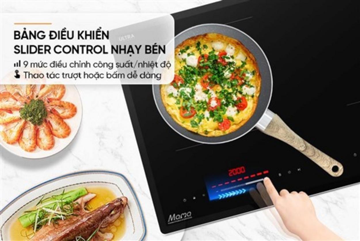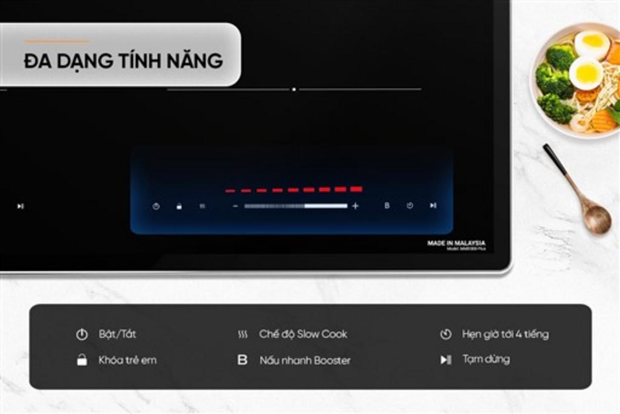 Sản phẩm kết hợp Booster 2.200W mỗi vùng để nấu nhanh, giúp rút ngắn thời gian chế biến; công nghệ Inverter ổn định công suất, giảm hao phí điện. Mặt kính Ultra Vitro Ceramic dày 4mm bền, dễ lau; bảng điều khiển Slider với 9 mức cho thao tác chính xác và tiện lợi.