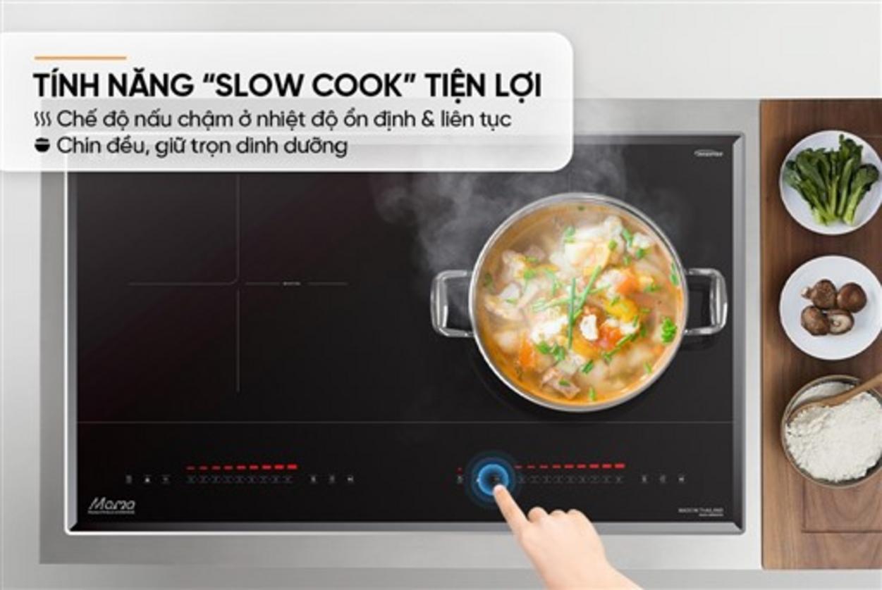 Với hai vùng nấu tích hợp Booster 2200W mỗi vùng (tổng ~4400W), bạn có thể đun sôi nhanh khi cần. Chế độ Slow Cook giữ nhiệt ổn định để món ăn chín đều và giữ dưỡng chất, phù hợp khi bạn muốn chuẩn bị các món hầm, ninh nhừ cho bữa tối gia đình. Nếu bạn muốn tham khảo thêm về các mẫu Bếp từ, chúng tôi có tư vấn chi tiết.