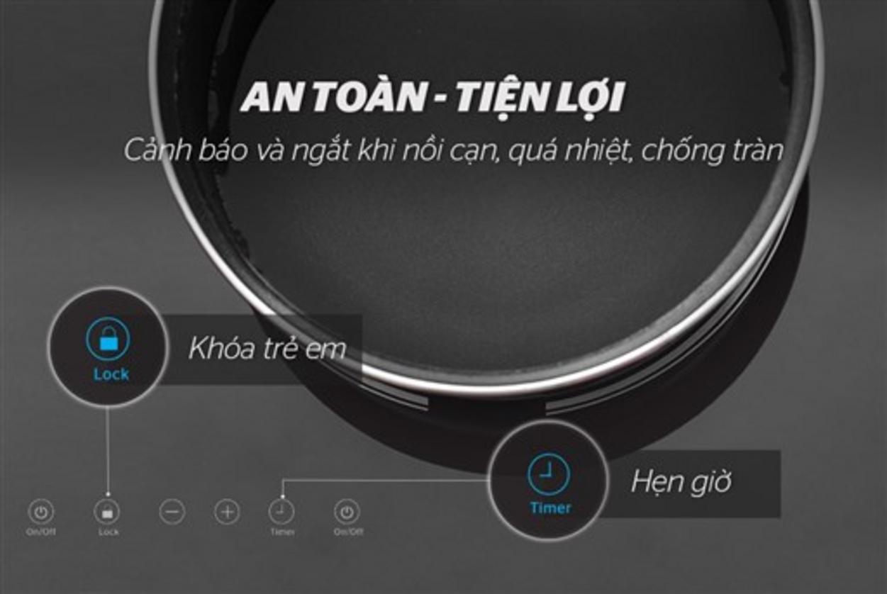 An tâm khi nấu nhờ bộ tính năng an toàn đầy đủ. Hẹn giờ tới 240 phút phù hợp món ninh, khóa trẻ em ngăn thao tác vô ý và hệ thống tự ngắt khi quá nhiệt hoặc không có nồi. Những chức năng này giảm rủi ro bỏ quên bếp và tai nạn trong gia đình.
