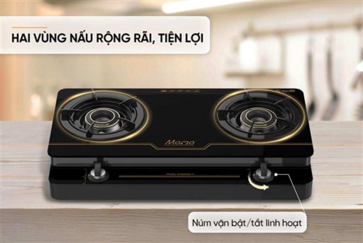 Sản phẩm có thiết kế 2 vùng nấu, phù hợp bếp gia đình. Thao tác đơn giản với đánh lửa bằng Magneto, bền và nhạy.