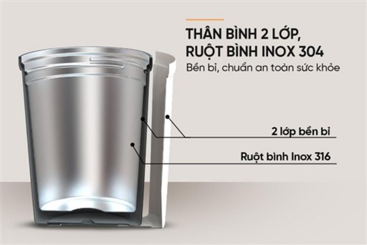 | Thân – Nắp – Gioăng | Ruột bình: INOX 304; Vỏ bình: INOX 201; Gioăng: Silicon; Nắp: Nhựa PP nguyên sinh |