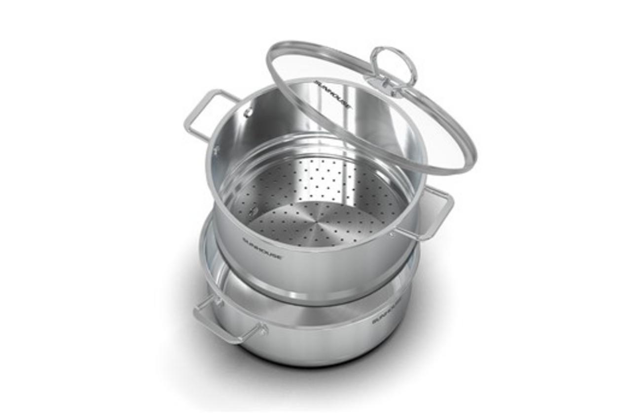 • Lợi ích sử dụng: Hấp và nấu cùng lúc giúp bạn rút ngắn thời gian bếp núc, giảm dùng dầu mỡ và giữ dưỡng chất; xửng cao hấp được lượng lớn (khoảng 5–6 bánh bao hoặc đủ rau củ cho 3–6 người); đáy 3 lớp làm thức ăn chín đều và tiết kiệm gas/điện.