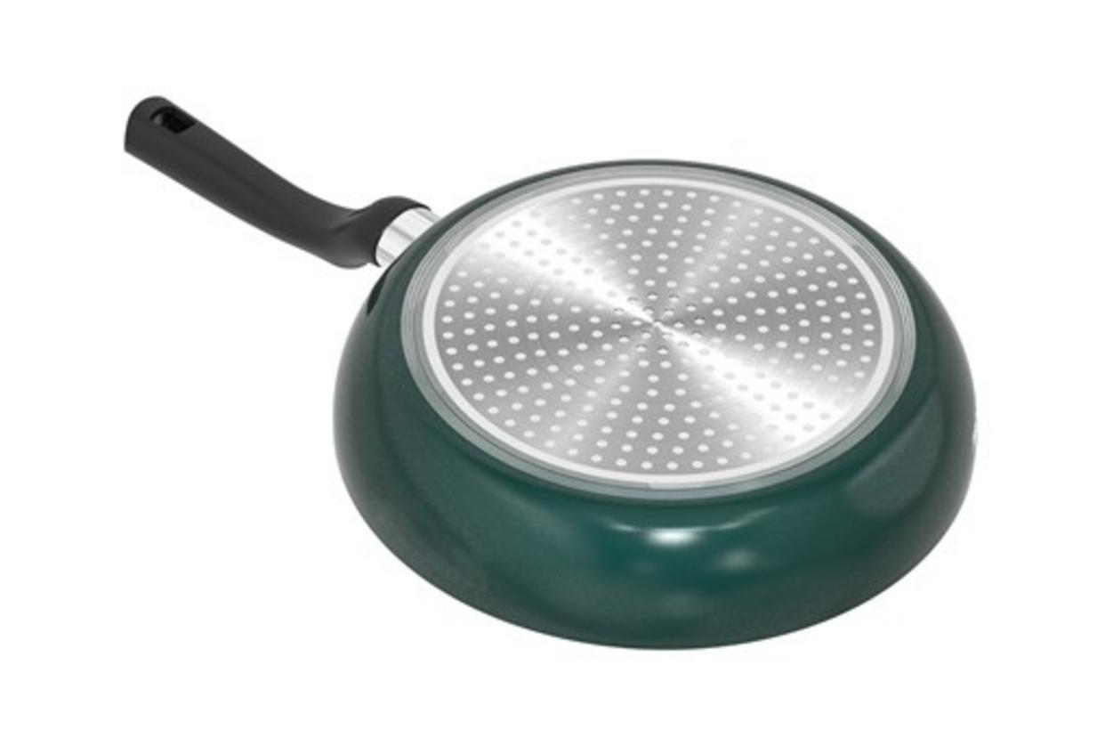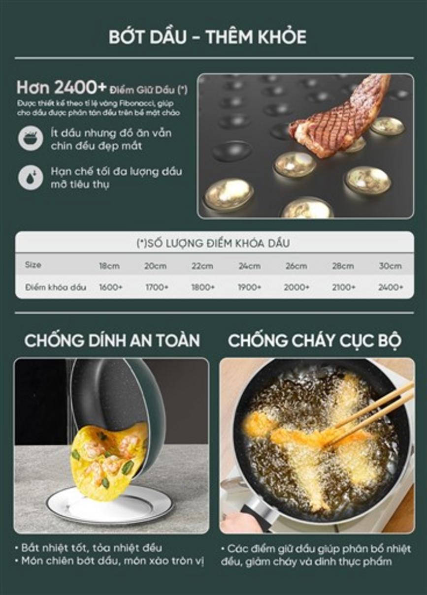 Sản phẩm sử dụng bề mặt có hơn 1700 điểm Oil‑Lock tạo các hạt dầu li ti. Cơ chế này làm dầu tụ thành lớp mỏng tại các điểm nhô, hạn chế dầu thừa bám vào thực phẩm và giảm lượng dầu thấm vào đồ ăn. Nhờ đó, bạn nấu được món giòn mà ít béo hơn và rửa chảo nhanh hơn.