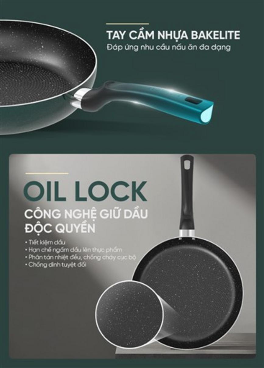 Oil‑Lock là công nghệ bề mặt với hơn 1700+ điểm khóa dầu trên lòng chảo, thiết kế để giữ lớp dầu mỏng trên bề mặt chống dính. Nhờ vậy, bạn sẽ dùng ít dầu hơn khi chiên hoặc xào mà vẫn đạt độ vàng giòn cần thiết. Muốn thử ngay tại nhà: cho một thìa nhỏ dầu vào lòng chảo, nghiêng nhẹ để quan sát, nếu dầu tụ thành màng mỏng và khó bám thành từng giọt thì Oil‑Lock đang hoạt động hiệu quả.