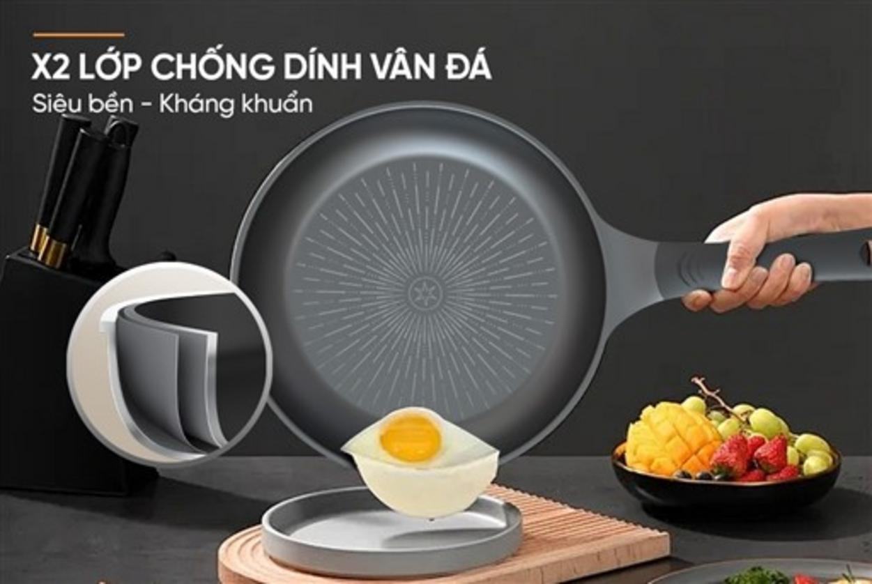 Nấu ít dầu, chống dính thật sự và dọn rửa trong vài giây — đây là cảm nhận bạn sẽ thấy ngay với lớp Whitford. Lòng chảo được phủ 2 lớp chống dính Whitford (Mỹ) vân đá, thiết kế để giảm sự bám dính và dễ lau sạch. Vật liệu không chứa PFOA nên an toàn hơn cho gia đình, đặc biệt khi nấu cho trẻ nhỏ hay người lớn tuổi. Bạn có thể xem ảnh bề mặt để thấy kết cấu vân đá rõ nét.