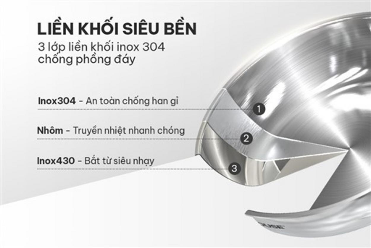 Cấu tạo 3 lớp liền khối giúp truyền nhiệt đều và bền.