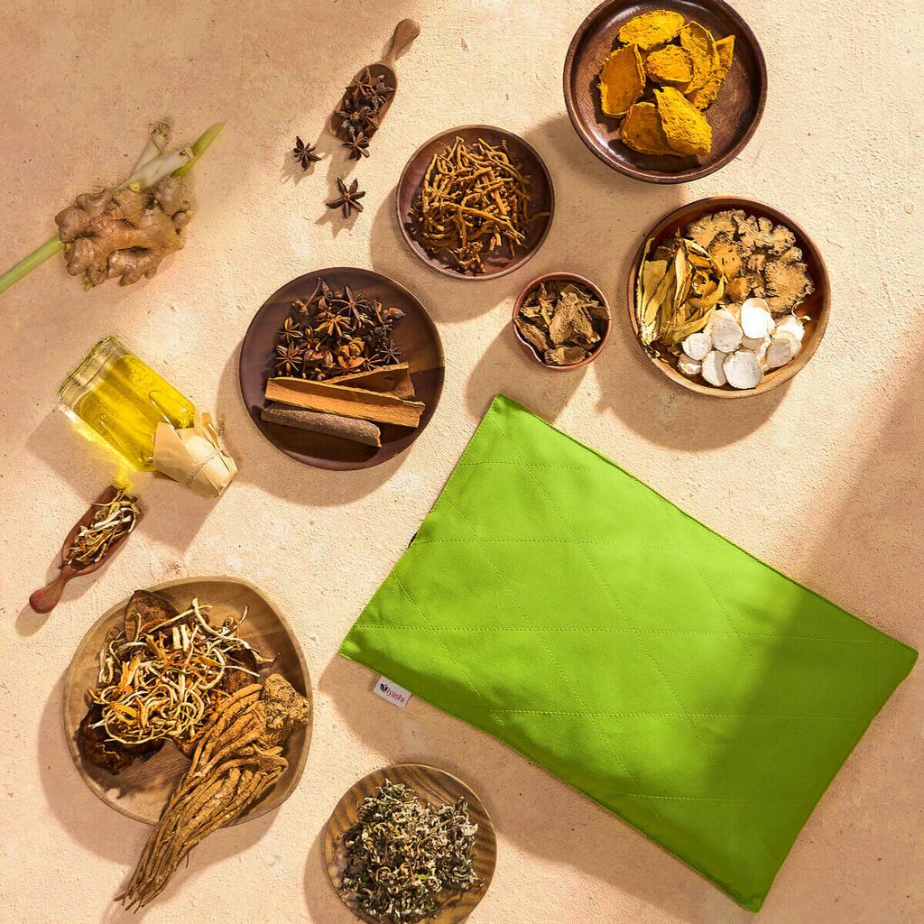 • Túi thảo dược 100% thiên nhiên — ngải cứu, gừng, nghệ, xuyên khung và sả tạo hương nhẹ, hỗ trợ thư giãn và lưu thông máu.