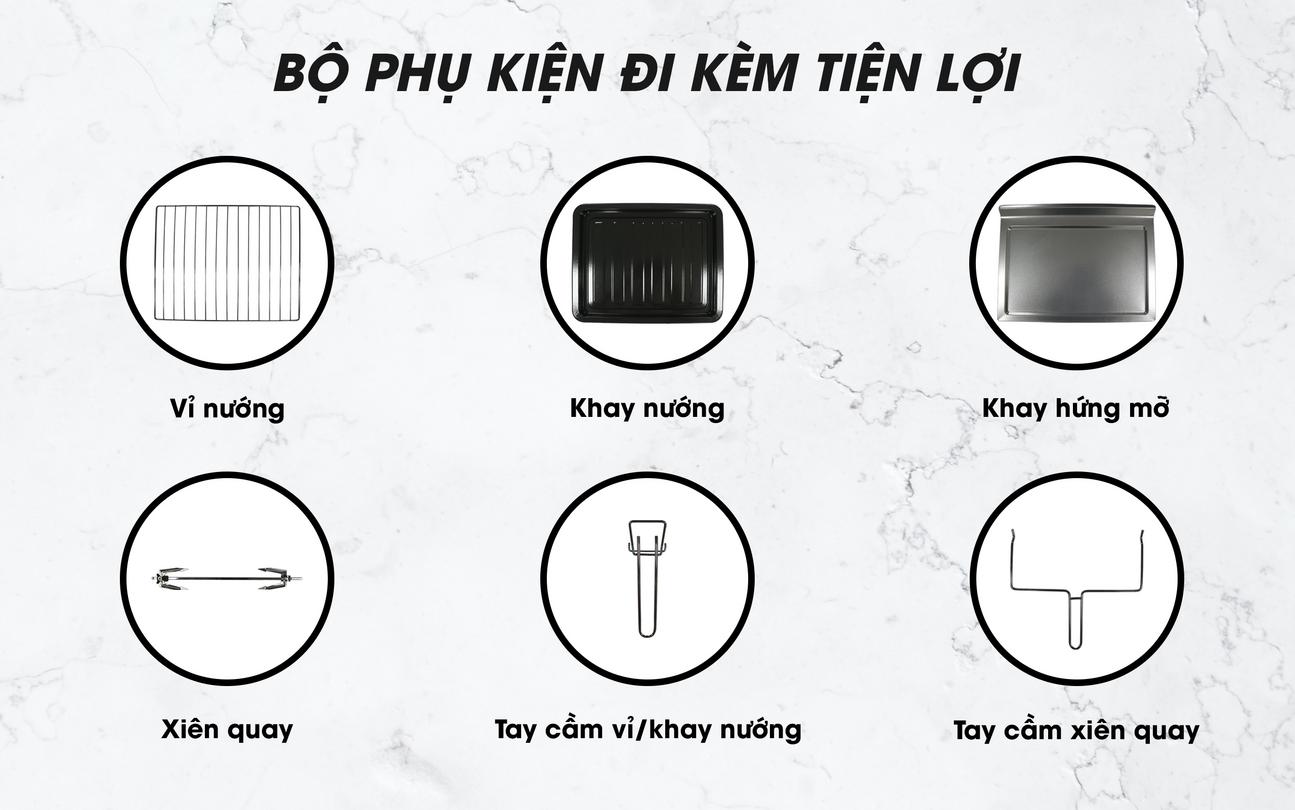 Sản phẩm thiết kế gọn, điều khiển bằng 3 núm xoay, nhiệt độ điều chỉnh 100°C–230°C, phù hợp để nướng gà, bánh và các món nướng hàng ngày cho gia đình 2–3 người.