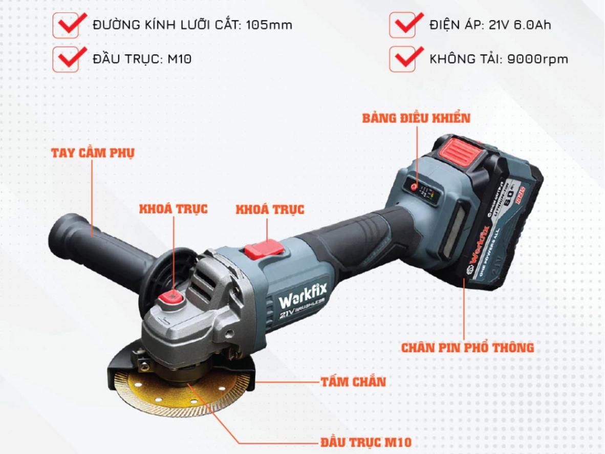 Máy cắt mài pin Workfix WF-AG100PRO là thiết bị đa năng kết hợp chức năng cắt và mài với công nghệ không chổi than hiện đại, được thiết kế đặc biệt cho nhu cầu của thợ và nhà thầu Việt Nam. Đây là giải pháp 2-trong-1 cho thợ cơ khí, thợ xây, thợ sửa chữa, thợ mộc và người dùng DIY chuyên nghiệp cần một máy cầm tay hiệu năng cao và an toàn. Tại Siêu Thị Đại Việt — đại lý phân phối chính hãng — chúng tôi cam kết mang đến sản phẩm chính hãng, giá cạnh tranh và dịch vụ hậu mãi toàn quốc.