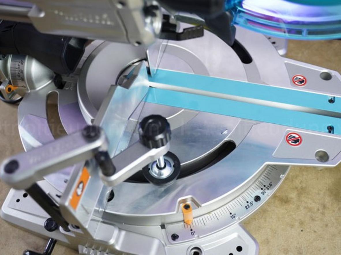 Laser định vị trên Makita LS1019L giúp căn đường cắt chính xác ngay cả khi lưỡi đang quay.