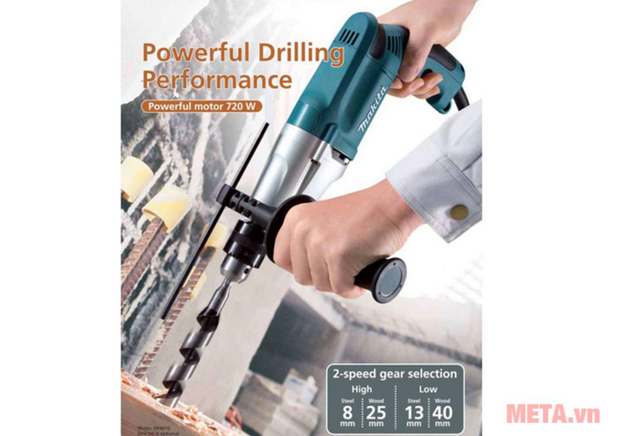 Động cơ 720W mang lại lực khoan lớn, giúp hoàn thành lỗ khoan nhanh hơn và giữ RPM ổn định khi có tải. Điều này có nghĩa bạn ít phải dừng đổi mũi khoan hoặc tăng lực tay. Makita tối ưu truyền động để xử lý thép và gỗ liên tục mà không bị tụt tốc.