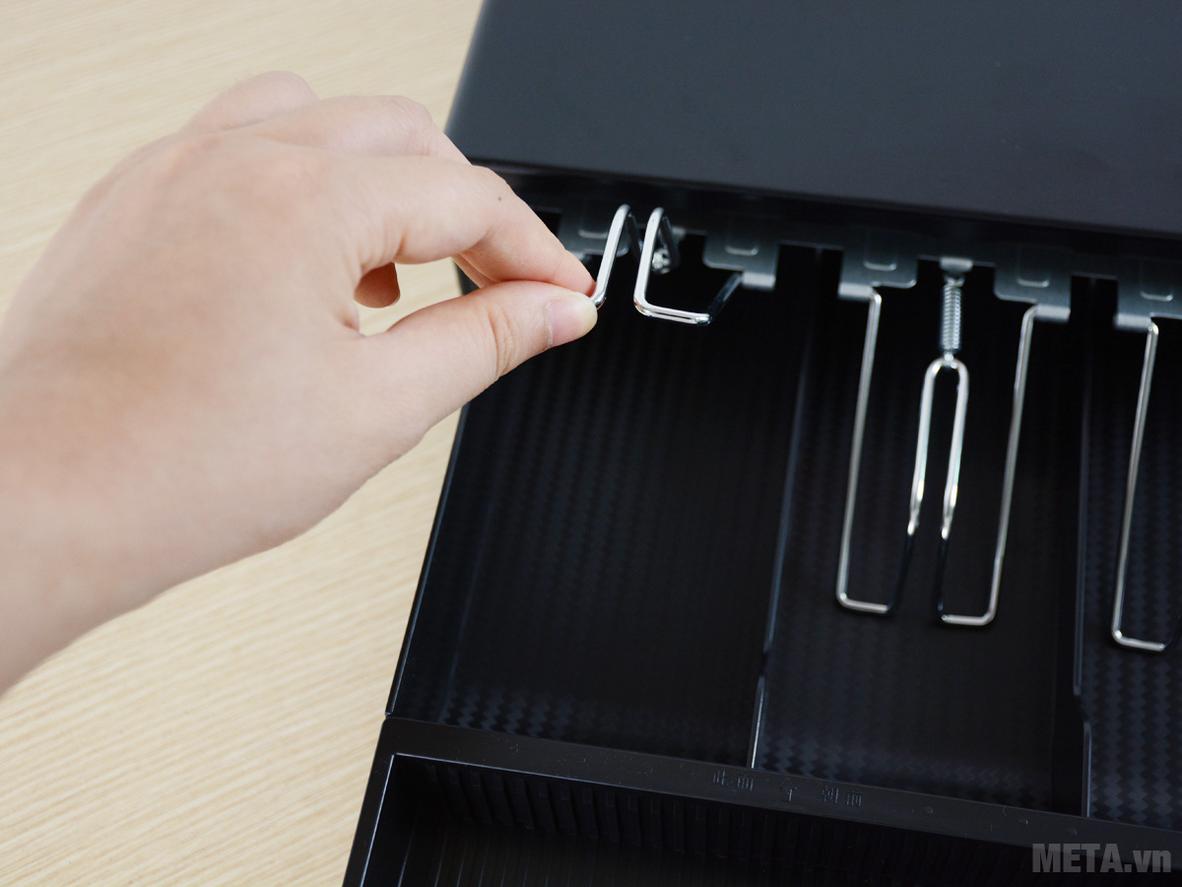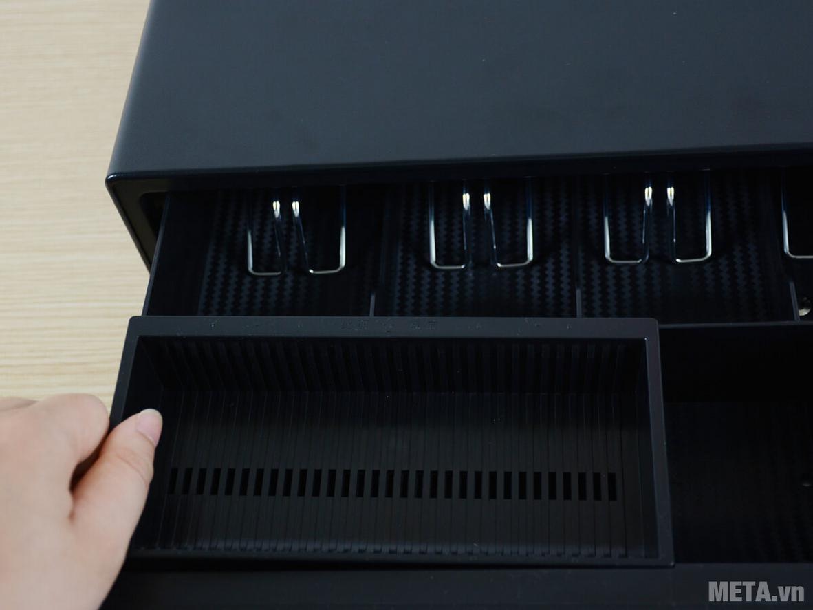 Sắp xếp tiền theo mệnh giá nhanh, giảm sai sót khi trả khách. Ngăn kéo trang bị 4 ngăn tiền giấy có kẹp giữ và 5 ngăn tiền xu tháo rời, nên bạn dễ bố trí theo thói quen bán hàng. Thiết kế khay nhựa ABS giúp vệ sinh nhanh và thay đổi bố cục khi cần.
