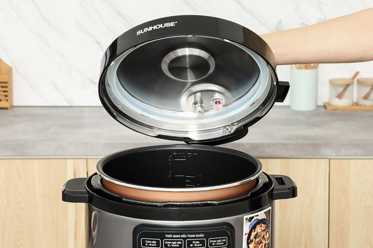 Sunhouse trang bị hệ thống an toàn 5 cấp độ cùng van xả áp tự động để giảm rủi ro khi dùng áp suất cao. Nắp có thể tháo rời nên bạn dễ kiểm tra và vệ sinh gioăng, van. Với hệ thống này, cha mẹ yên tâm khi nấu món hầm cho trẻ nhỏ — giảm nguy cơ bỏng và tai nạn do áp suất.