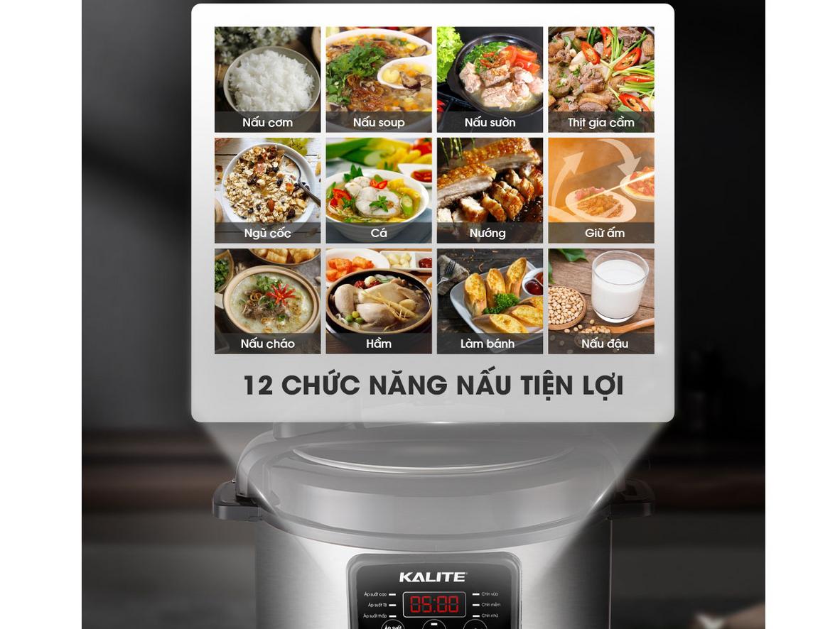 Tiết kiệm thời gian cho bếp mỗi ngày: Nồi áp suất điện Kalite KPC6088 – 6 lít giúp bạn hoàn thành bữa ăn nhanh, vẫn giữ trọn dinh dưỡng và an toàn khi sử dụng. Sản phẩm phù hợp gia đình 4–6 người, hoạt động ổn định với công suất 950W và 12 chế độ nấu tự động. Bạn chỉ cần chọn chế độ, nồi lo phần còn lại bằng bảng điều khiển LED rõ ràng.