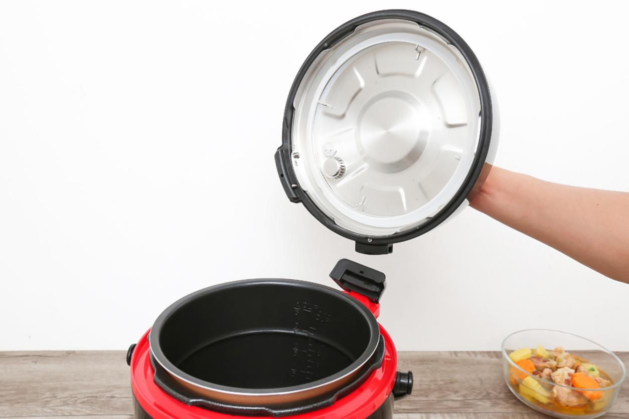 Đảm bảo an toàn cho bạn và gia đình bằng 4 bước đơn giản. 1) Tắt nguồn và chờ ít nhất vài phút để nhiệt giảm. 2) Dùng nút xả áp (nếu cần) để thải hơi ra từ từ, không để tay trực tiếp trên van. 3) Chờ cho van báo hiệu áp suất hạ xuống hoàn toàn (không còn tiếng rít hay áp lực). 4) Mở nắp từ từ, hướng lỗ thoát hơi ra phía xa người; tránh cúi mặt trên nắp để không bị bỏng hơi. Cảnh báo: không cố mở nắp khi còn áp suất — nguy cơ bỏng rất cao.