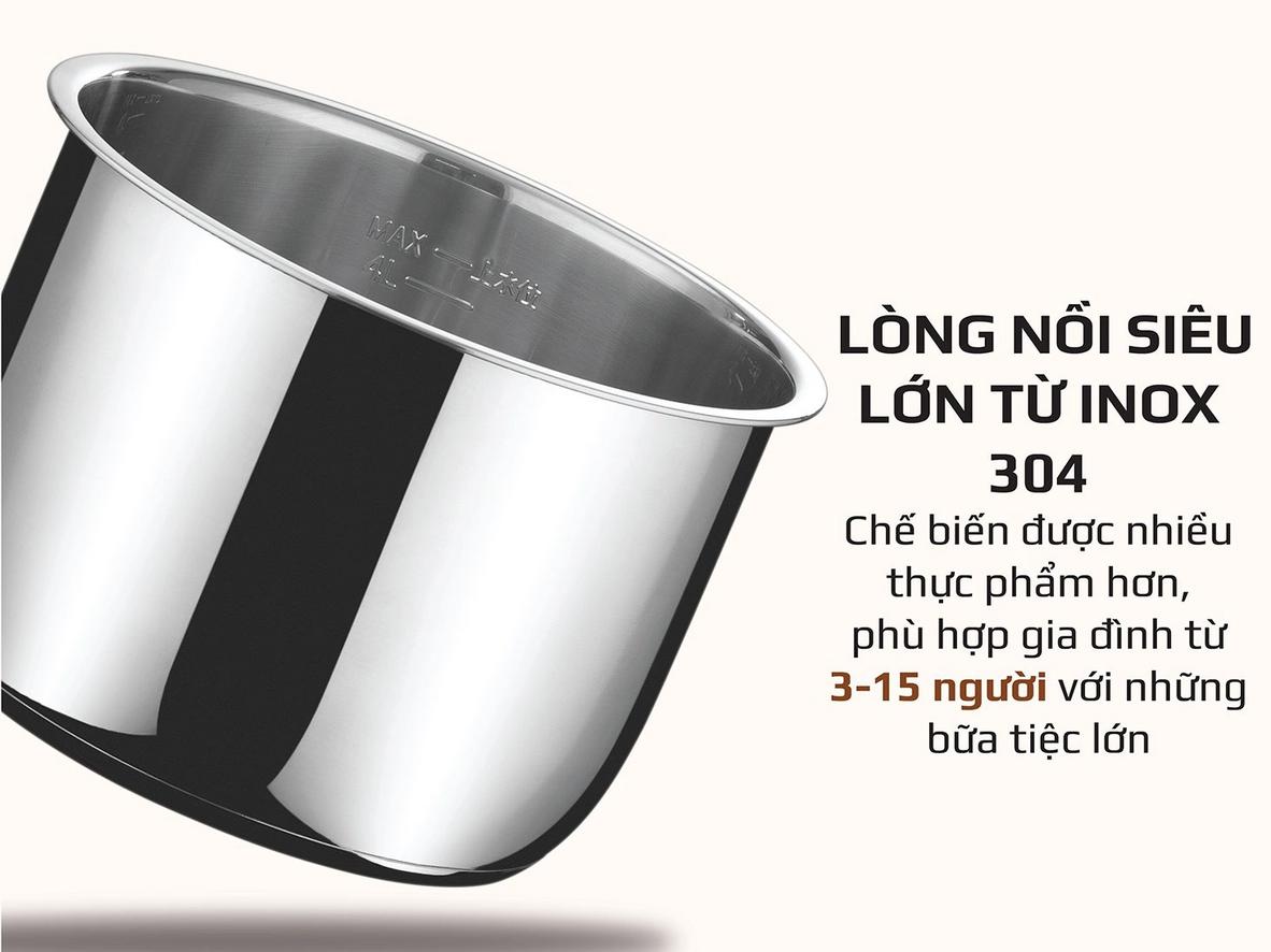 Lòng nồi Inox 304 an toàn, không gỉ và dễ vệ sinh mỗi ngày. Công suất 1.000W giúp thực phẩm chín nhanh, tiết kiệm điện năng. 16 chương trình sẵn sàng cho đủ món phổ biến của gia đình Việt.
