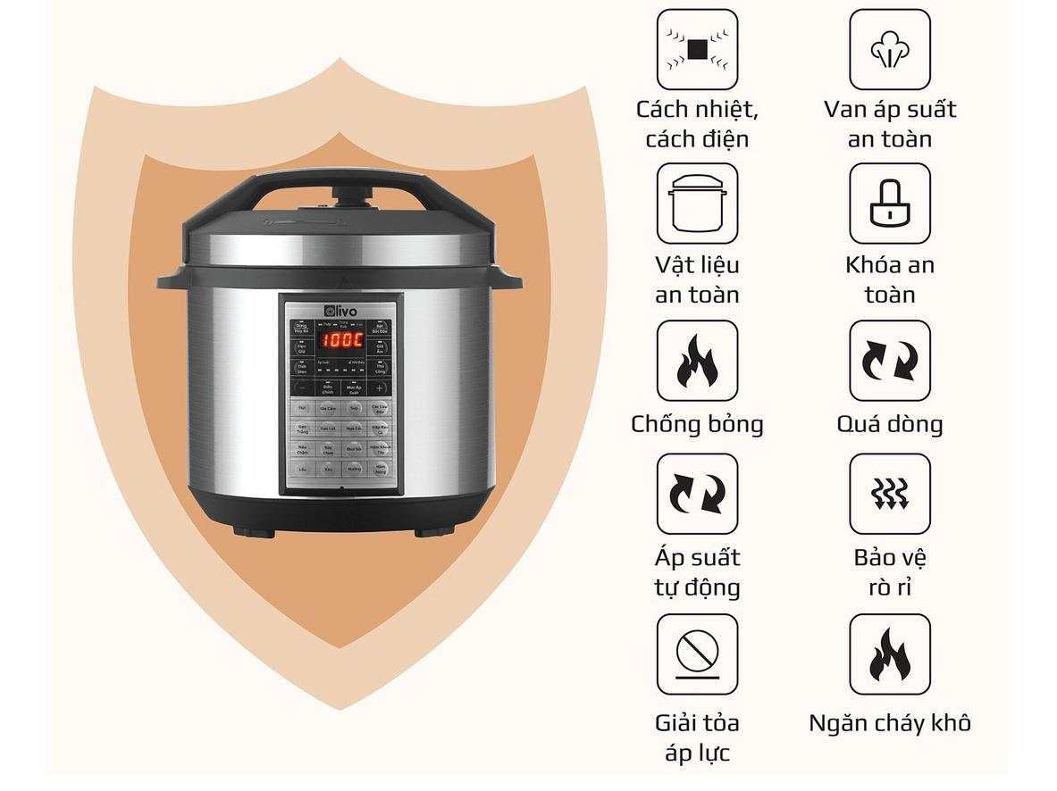 Hệ thống an toàn của Olivo PC60 giảm tối đa rủi ro trong khi nấu áp suất. Van xả áp tự động và cơ chế chống bỏng giúp hơi và áp suất thoát an toàn trước khi mở nắp. Khóa nắp an toàn ngăn nắp mở khi nồi còn áp, bảo vệ cả trẻ em quanh bếp.