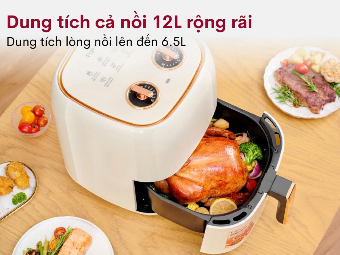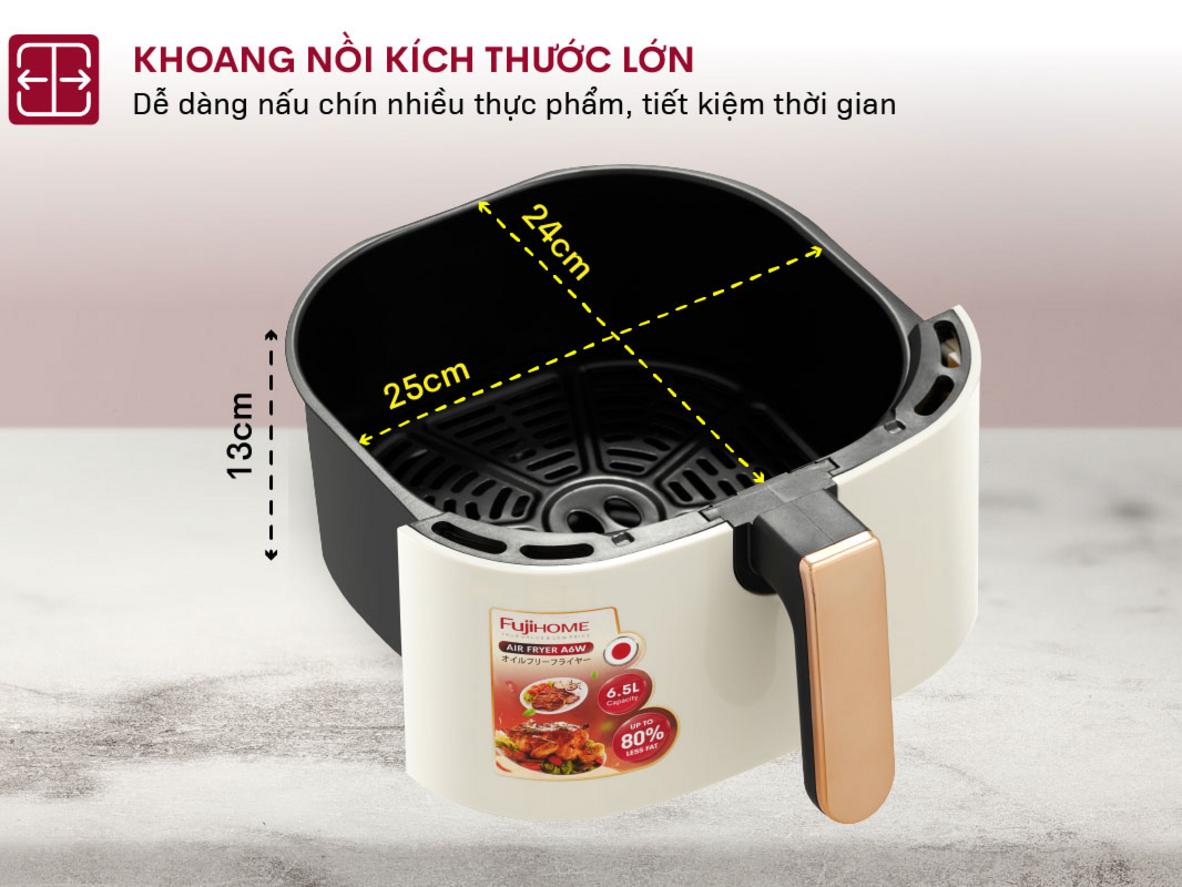 • Định nghĩa: Nồi chiên không dầu Fujihome A6W có lòng nồi 6.5 lít, thiết kế dành cho gia đình 4–8 người — vừa đủ cho bữa ăn gia đình mà không phải nấu nhiều lần.