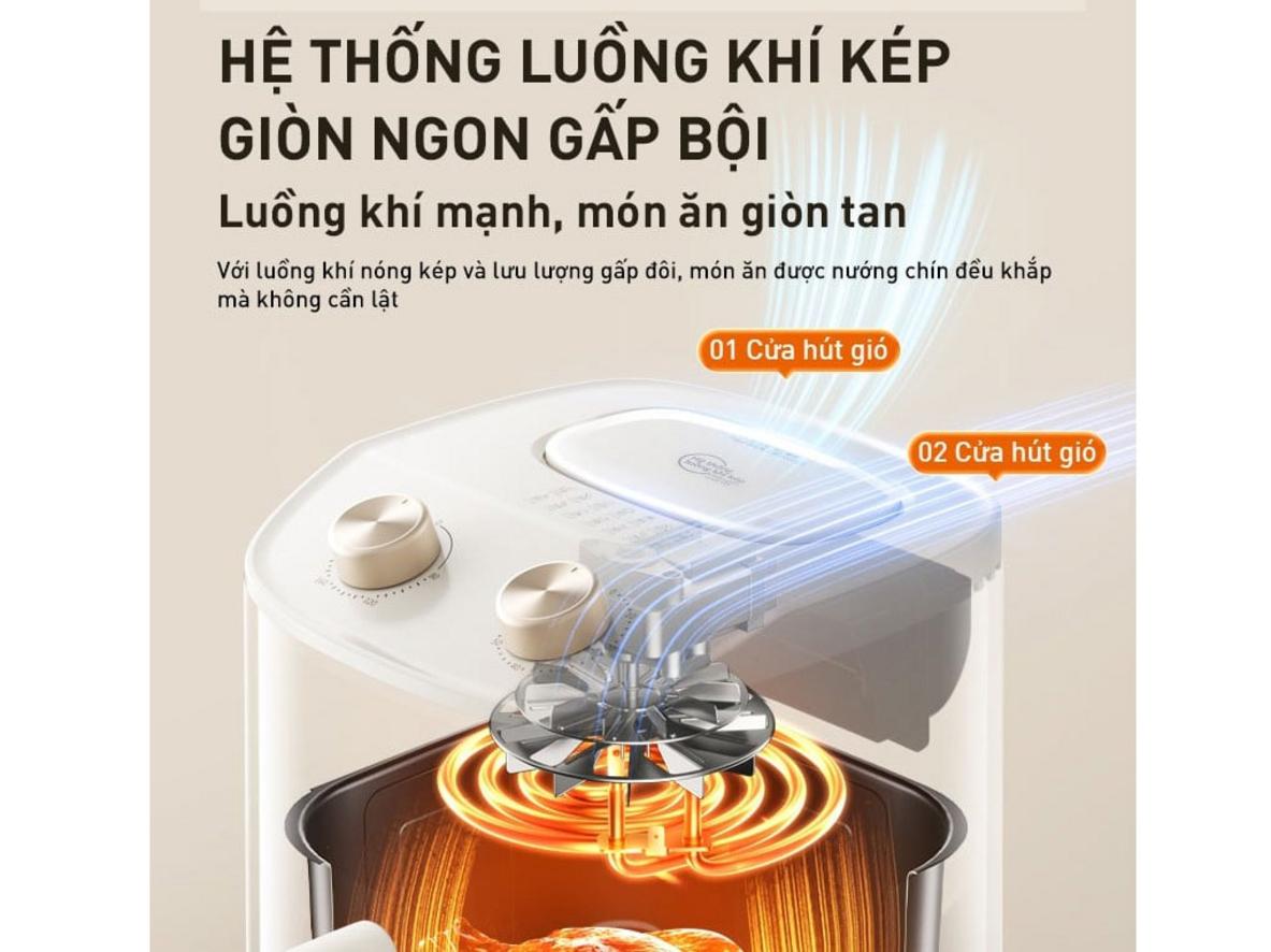 Theo ước tính từ công nghệ luồng khí kép, nồi có thể giảm đến khoảng 80% dầu mỡ so với chiên ngập dầu, vì luồng khí nóng thay thế phần lớn vai trò của dầu để tạo lớp vỏ giòn. Kết quả thay đổi theo từng món: thực phẩm nhiều dầu hoặc ướp nhiều mỡ sẽ vẫn giữ lại một phần dầu, nhưng nhìn chung bạn sẽ có món ăn giòn rụm, ít dầu và an tâm hơn về dinh dưỡng.