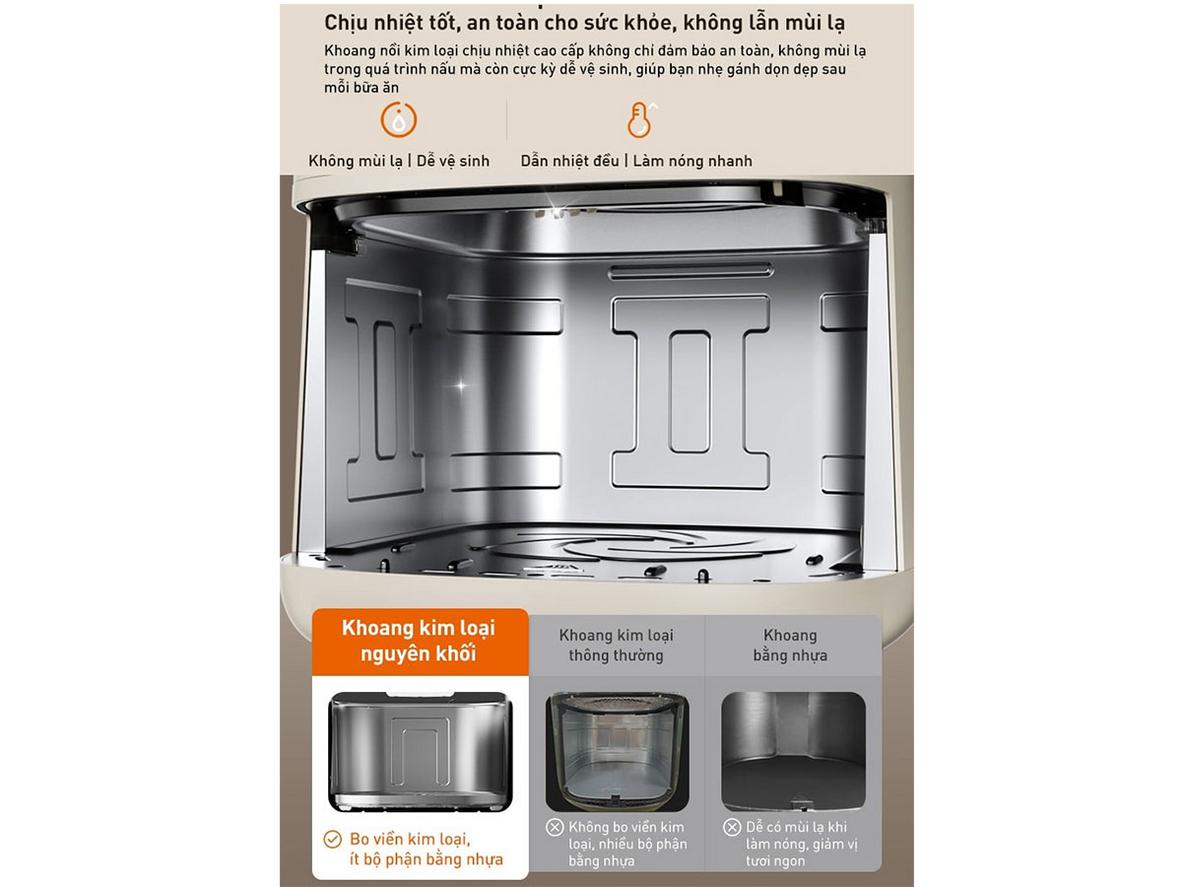 • Chất liệu: Khoang nồi kim loại nguyên khối + khay chống dính — bền & dễ vệ sinh.