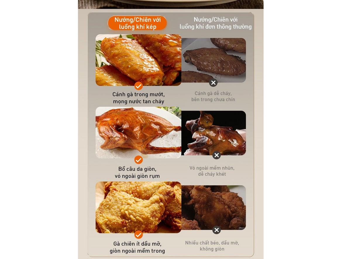 • Công nghệ: Luồng khí kép (Dual Airflow) — giòn ngoài, mềm trong (luồng khí di chuyển mạnh hơn giúp chín đều).