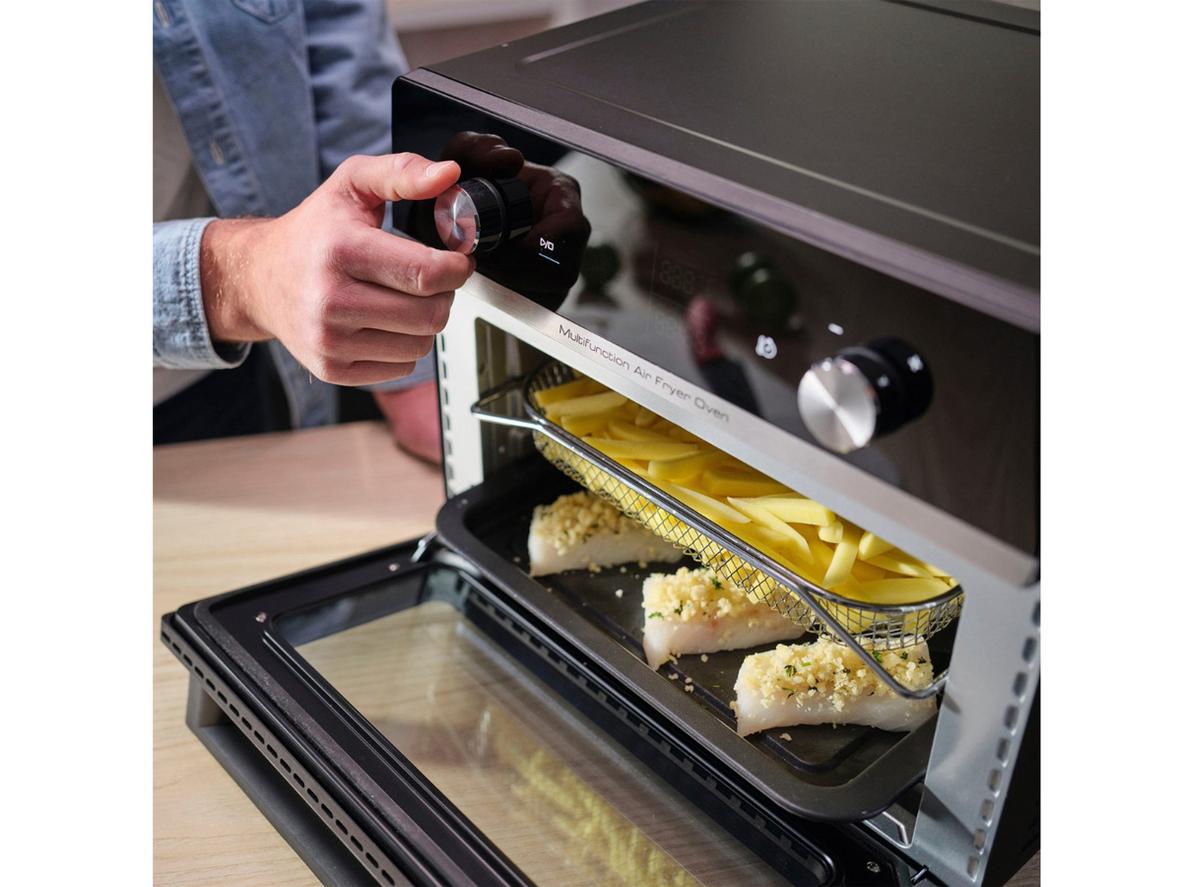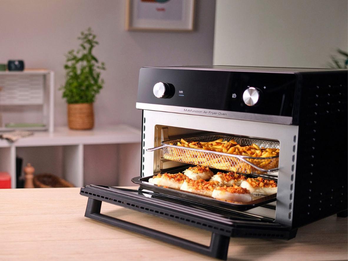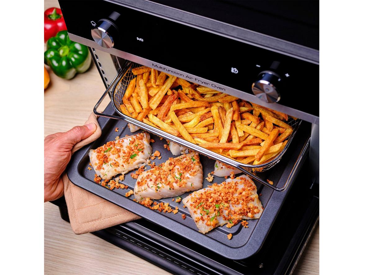 Extra Crisp tạo lớp vỏ vàng giòn bên ngoài, giúp bạn gần như không cần dầu vẫn có kết quả giòn tan. Công nghệ này kết hợp luồng khí nóng mạnh và điều khiển nhiệt chính xác để làm se bề mặt, trong khi công suất 1.800W giúp thực phẩm chín nhanh và đều. Nhờ hai thanh nhiệt trên/dưới, bạn không cần lật trở, món ăn giữ được độ mọng bên trong và giảm khói dầu trong bếp. Kết quả: món gà quay, khoai tây hay pizza có phần vỏ giòn như chiên nhưng ít dầu hơn rất nhiều.