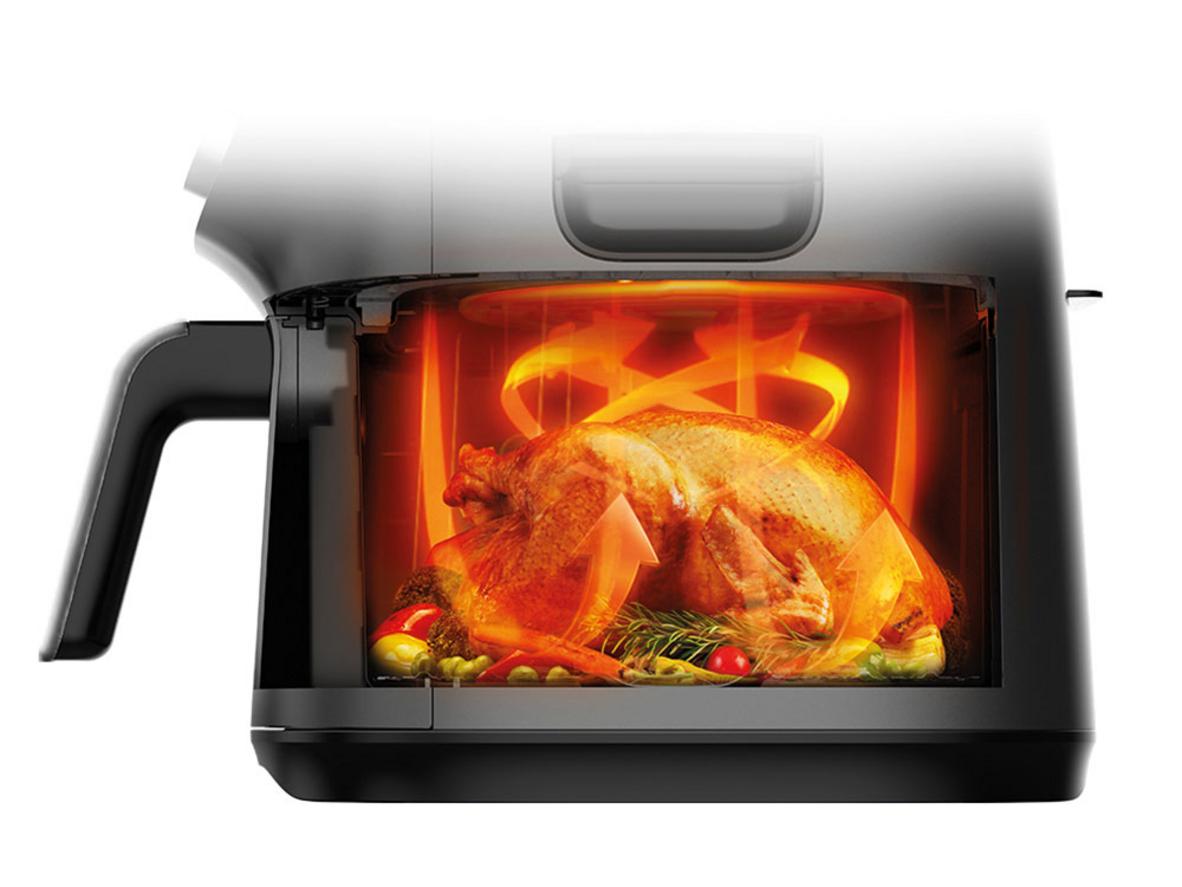 Dung tích tổng 7.4 lít, dung tích sử dụng khoảng 6.89 lít, đủ cho gà 2.2kg nướng nguyên con. Công suất 1.550–1.850W (mức tiêu chuẩn 1.800W) làm nóng nhanh, rút ngắn thời gian nấu so với phương pháp truyền thống. Thiết kế gọn nhưng chứa thực phẩm lớn, phù hợp gia đình 4–6 người.