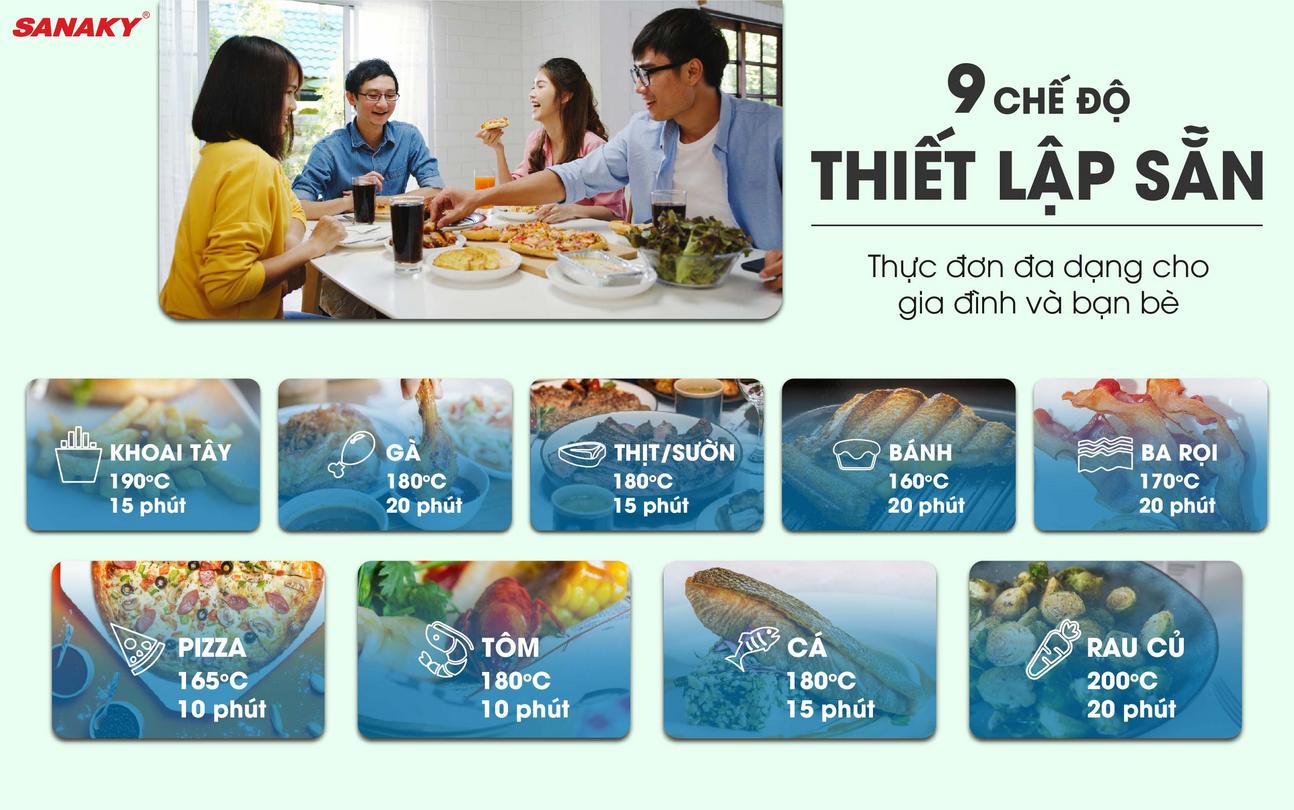 9 chế độ sẵn giúp người bận rộn nấu nhanh mà không cần căn chỉnh phức tạp. Khay chiên bằng thép phủ chống dính tháo rời giúp vệ sinh cực nhanh, giảm lo vết bám. Bạn thao tác dễ, ít tốn thời gian dọn dẹp sau bữa ăn.