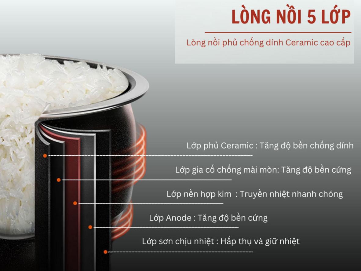 Dọn dẹp nhanh, bạn có thêm thời gian cho việc khác. Lòng nồi hợp kim nhôm phủ chống dính (dày khoảng 2mm) giảm hiện tượng cơm bám và trầy xước khi dùng đúng cách. Vệ sinh đơn giản, không cần cọ mạnh hay ngâm lâu; điều này đặc biệt hữu ích cho gia đình bận rộn hoặc người không thích mất thời gian rửa chén.
