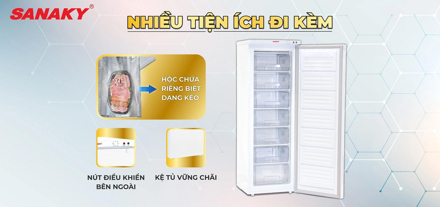 Bạn muốn lưu trữ gọn gàng và lấy thực phẩm nhanh? Tủ Đông Sanaky VH-230VD cho bạn 7 hộc riêng, dung tích phù hợp cho gia đình và quán nhỏ. Thiết kế dạng Tủ đông đứng giúp tiết kiệm diện tích và hạn chế thất thoát nhiệt khi mở cửa.