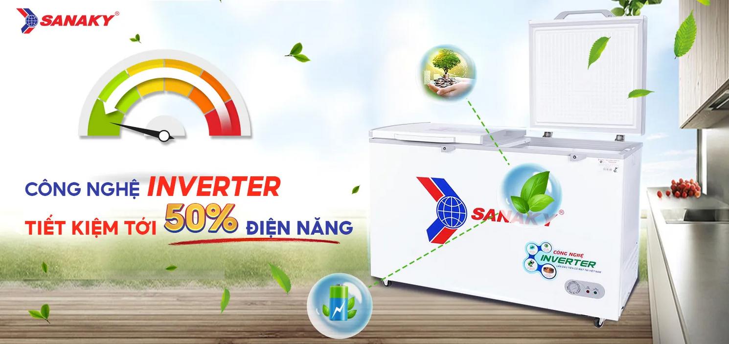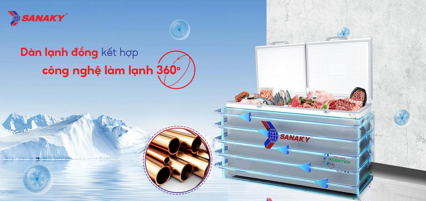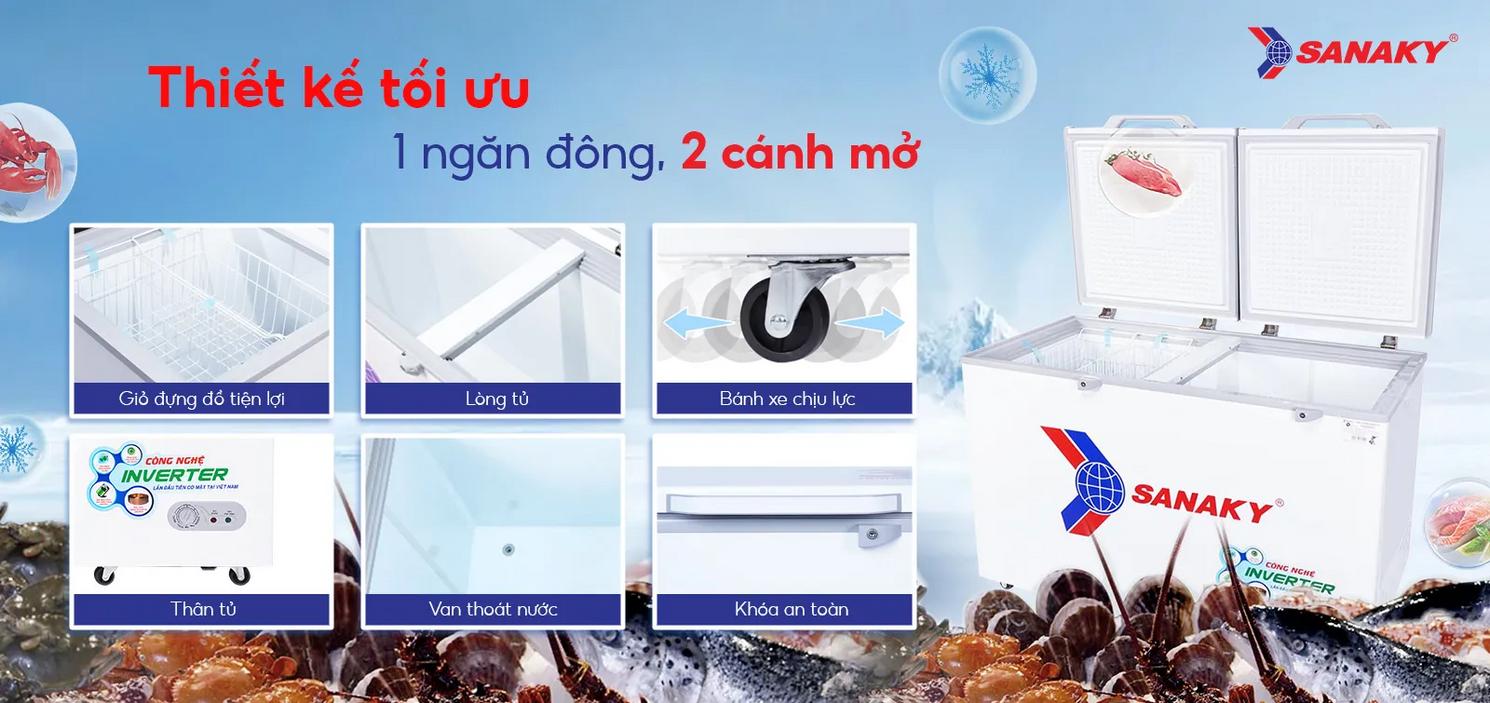 Tủ Đông Sanaky VH-5699HY3 mang dung tích sử dụng 410 lít, đủ cho gia đình và cửa hàng nhỏ. Công nghệ Smart Inverter giúp tiết kiệm điện tới 50%, giảm chi phí vận hành hàng tháng. Dàn lạnh ống đồng và làm lạnh 360° giữ thực phẩm tươi lâu, hoạt động bền bỉ. Xem thêm các mẫu Tủ đông nếu bạn cần dung tích khác.