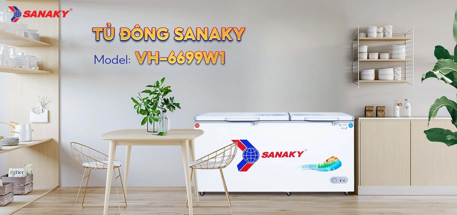 Tủ đông Sanaky VH-6699W1 là dòng tủ đông 2 ngăn (đông 335L, mát 150L), dung tích thực 485L (tổng 660L), thiết kế 2 cánh lật vali tiện lợi với **dàn lạnh đồng nguyên chất** và công nghệ làm lạnh 360°, giúp làm lạnh sâu nhanh chóng, ổn định ở **ngăn đông ≤ -18°C (tối đa -30°C)** và **ngăn mát 0-10°C**[1][2][3][5].