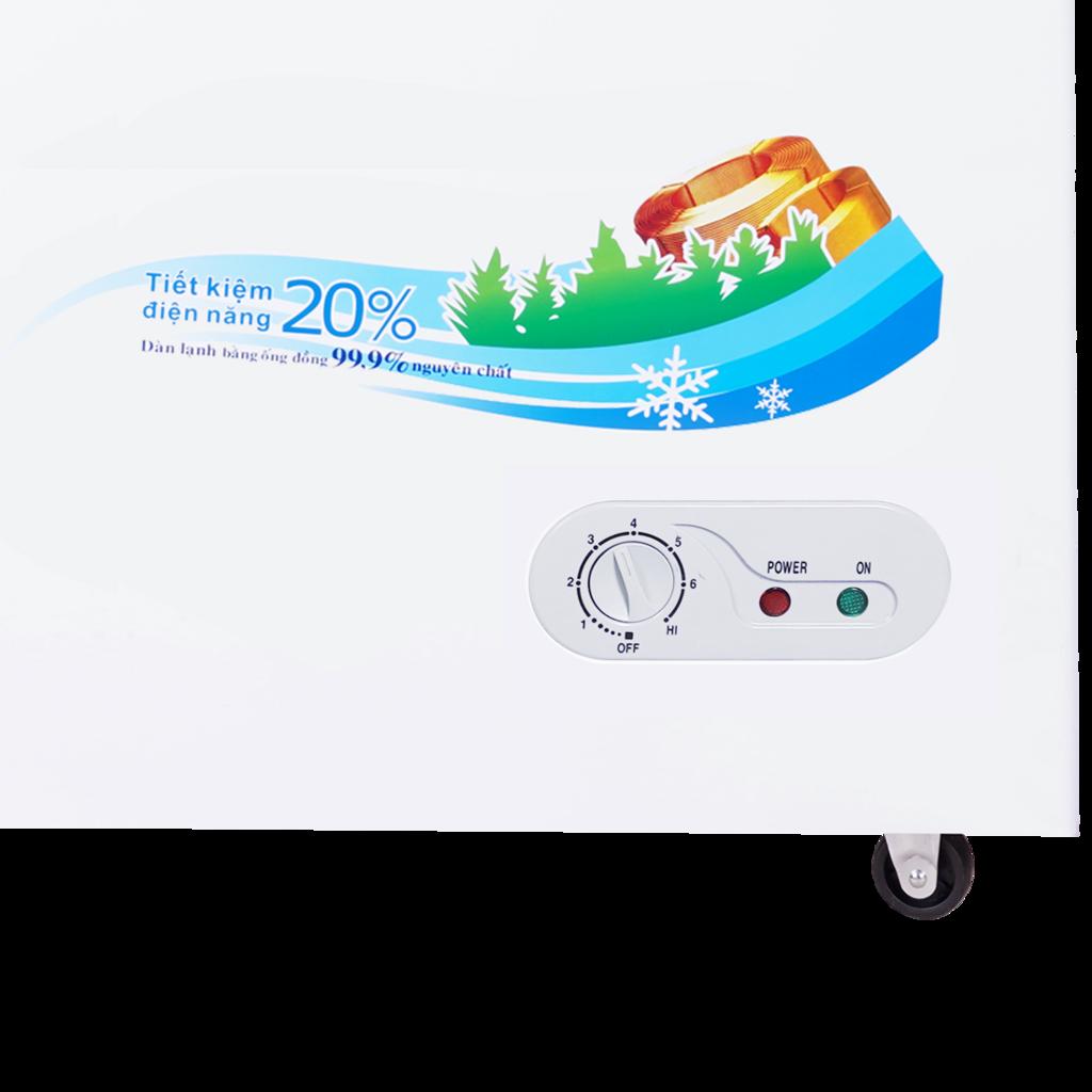 Được trang bị dàn lạnh đồng nguyên chất và công nghệ làm lạnh 360°, tủ làm lạnh nhanh hơn và bền hơn so với dàn nhôm thông thường — nghĩa là thực phẩm đông đá đều, tươi lâu và ít phải sửa chữa. Môi chất lạnh R600a thân thiện với môi trường và tiết kiệm điện; theo thử nghiệm, mức tiêu thụ khoảng 0.6 kWh/ngày. Ví dụ: với giá điện 3.000đ/kWh, chi phí vận hành chỉ khoảng 54.000đ/tháng — rất kinh tế cho quán ăn nhỏ.