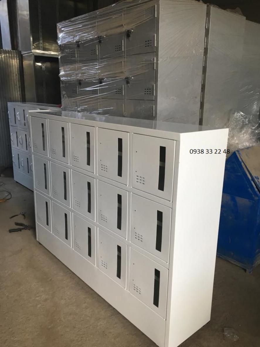 | Cấu tạo tủ | 1 khối gồm 5 khoang, mỗi khoang chia 3 ngăn nhỏ có cánh sắt mở, khóa locker liền tay nắm có tai khóa móc, mỗi cánh cửa có lỗ thông gió và phần kính dọc |