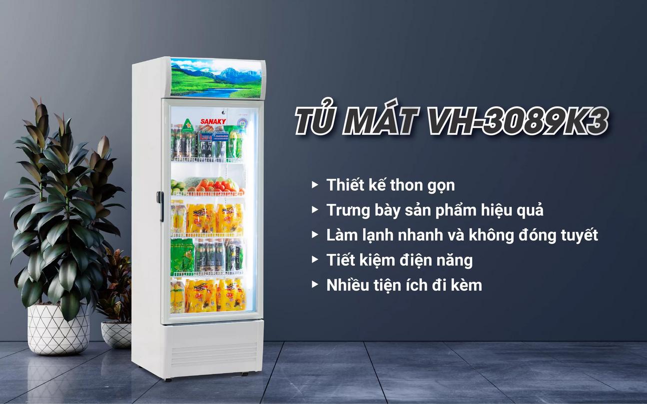 Tủ Mát Sanaky VH-3089K3 là tủ mát trưng bày dung tích 300 lít, 1 cánh kính, thiết kế phù hợp cho trưng bày đồ uống và thực phẩm; trang bị công nghệ Inverter và dàn lạnh bằng đồng để làm lạnh nhanh và đều. Sản phẩm sử dụng công nghệ No‑Frost (không bám tuyết) và cánh kính Low‑E giúp hiển thị sản phẩm rõ ràng, không đọng sương.